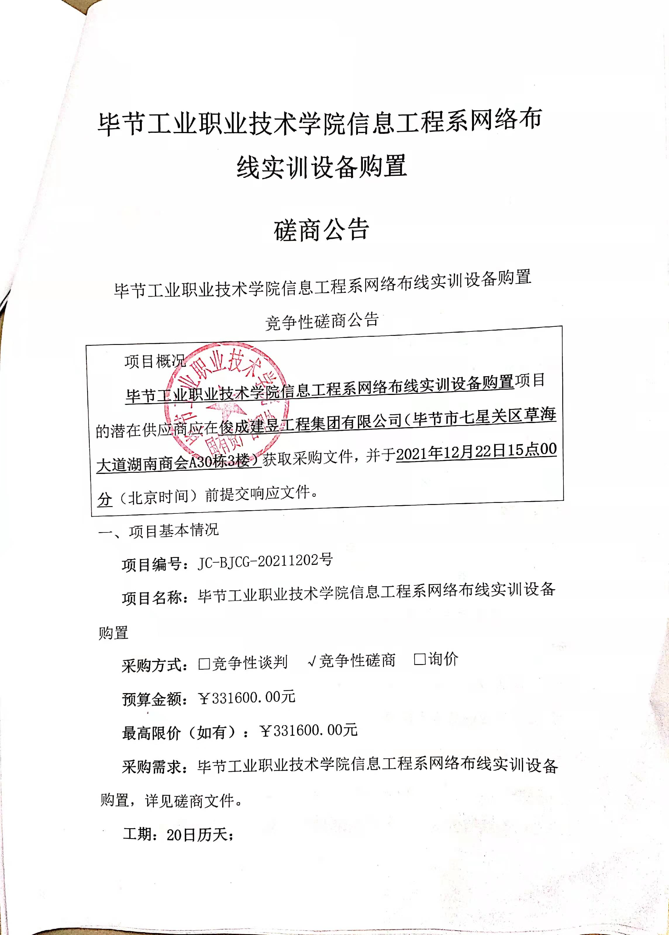 畢節(jié)工業(yè)職業(yè)技術(shù)學院信息工程系網(wǎng)絡(luò)布線實訓設(shè)備購置磋商公告