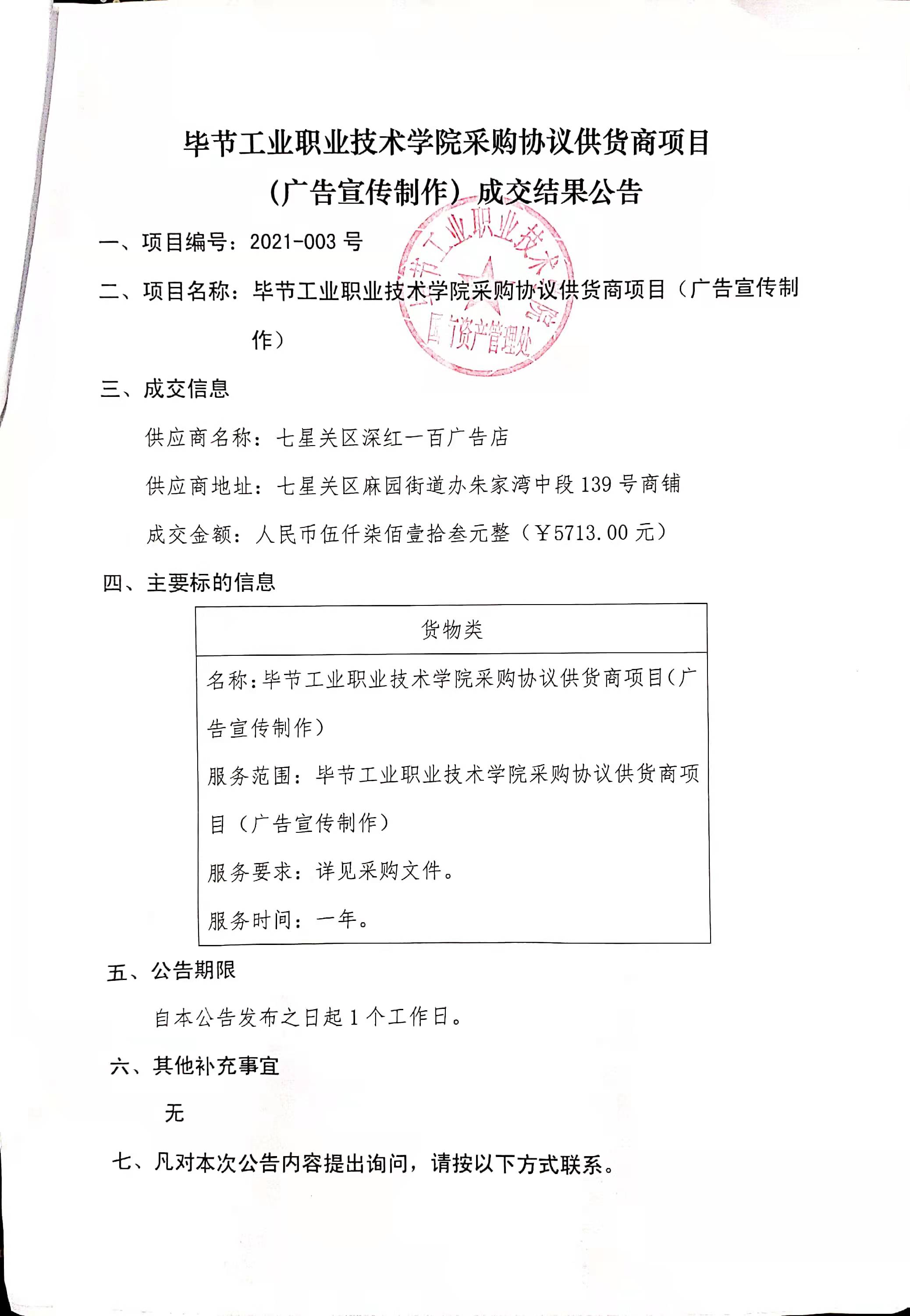 畢節(jié)工業(yè)職業(yè)技術(shù)學院采購協(xié)議供貨商項目(廣告宣傳制作)成交結(jié)果公告